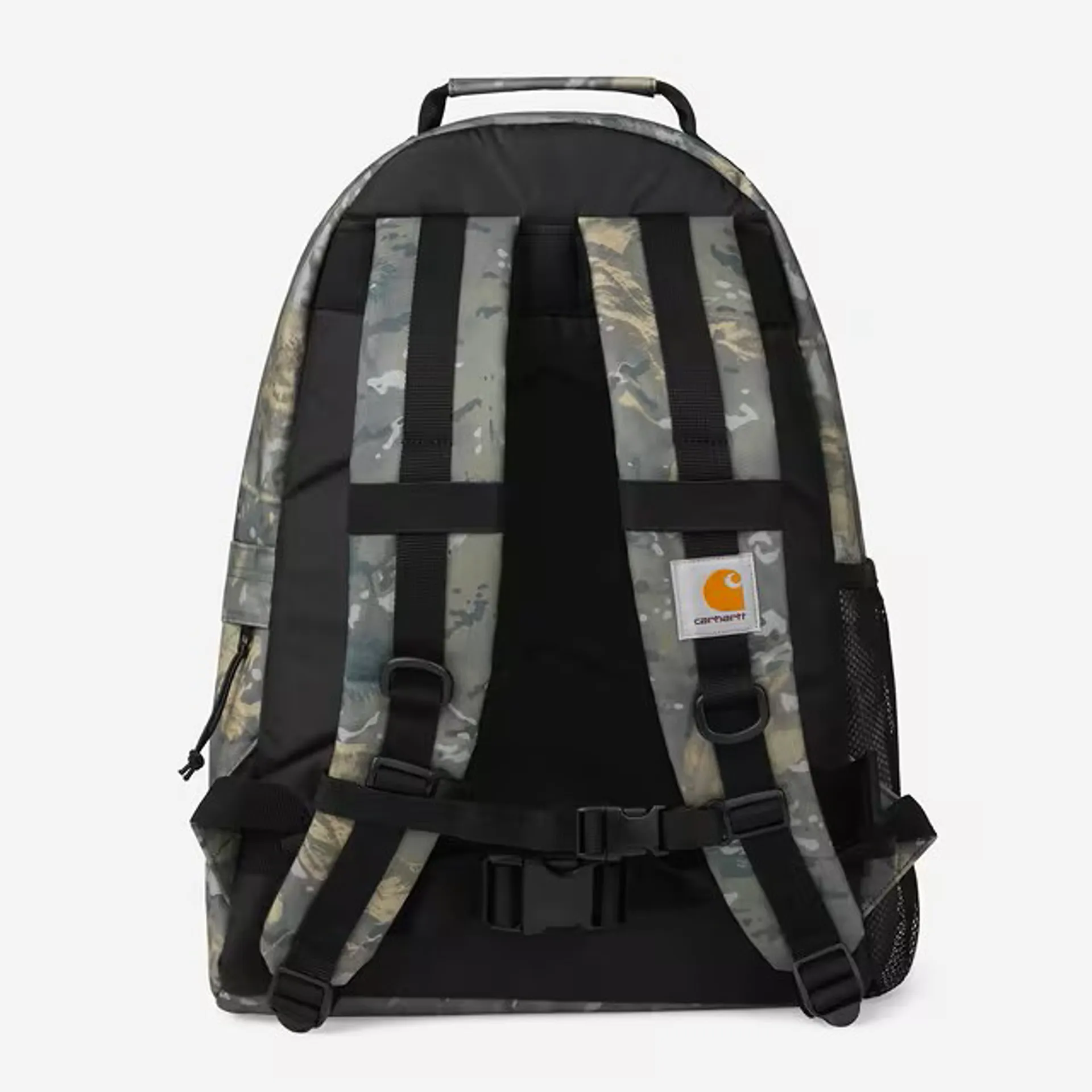 The Kickflip Backpack from Carhartt WIP is crafted from water repellent recycled polyester canvas with 3% polyurethane and features 24.8 litre capacity, padded back and shoulders, mesh and zipped side pockets, plastic clickers and branded square label to front.