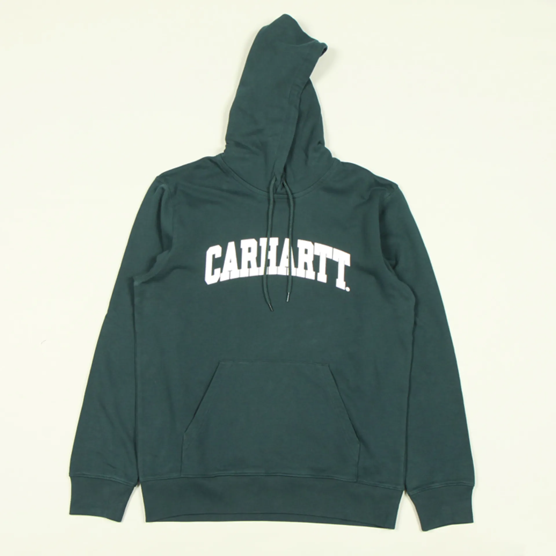 Regular fit, unbrushed cotton sweatshirt from Carhartt WIP. The Hooded University Sweat has a kangaroo pocket, adjustable hood and collegiate print.