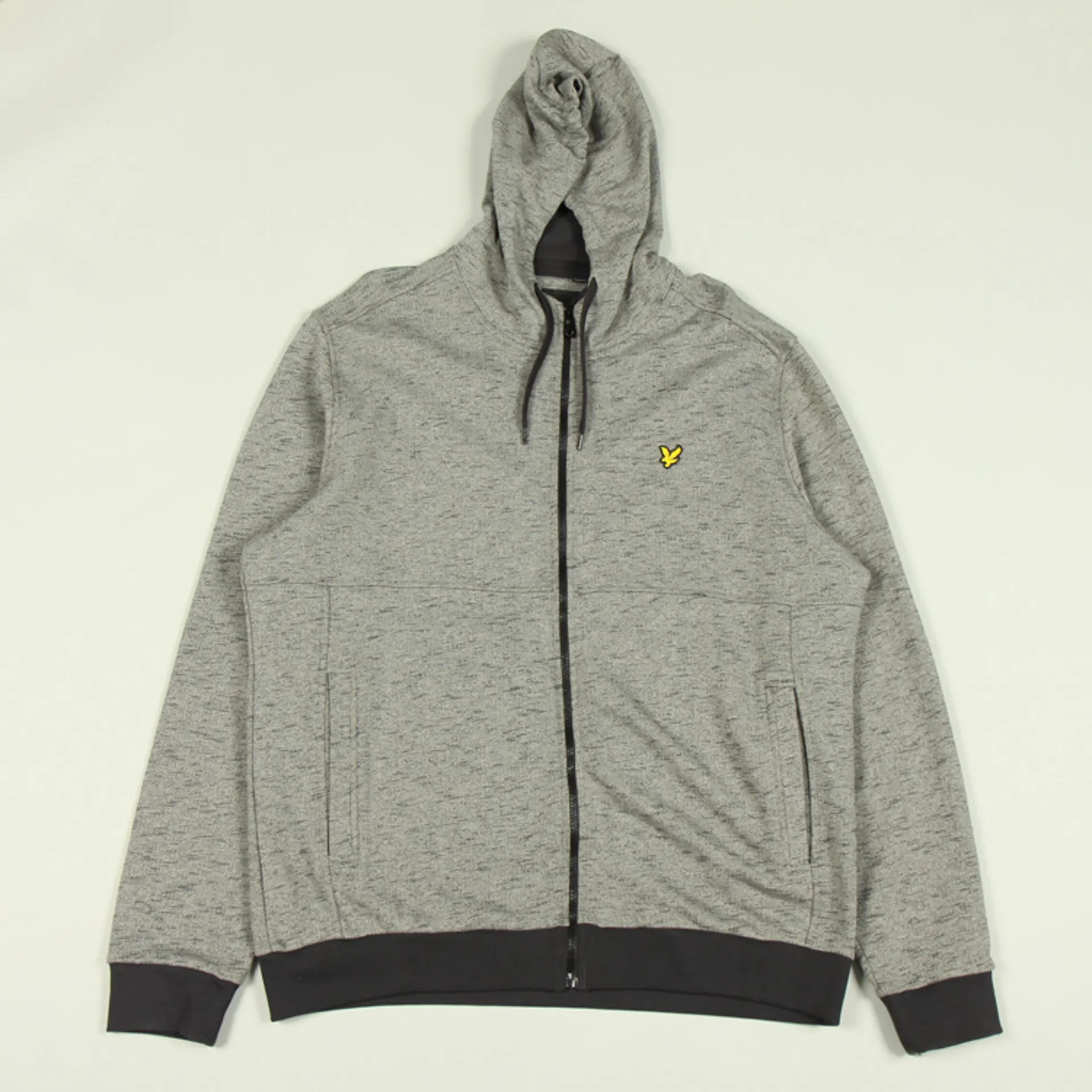 The Space Dye Zip Through Hoodie from Lyle and Scott is crafted from loopback cotton in a regular fit. The hoodie has a contrasting zip closure with branded zip pull, two front pockets, adjustable lined hood with contrasting drawcord, contrast ribbed cuffs and hem and their signature golden eagle at the chest.