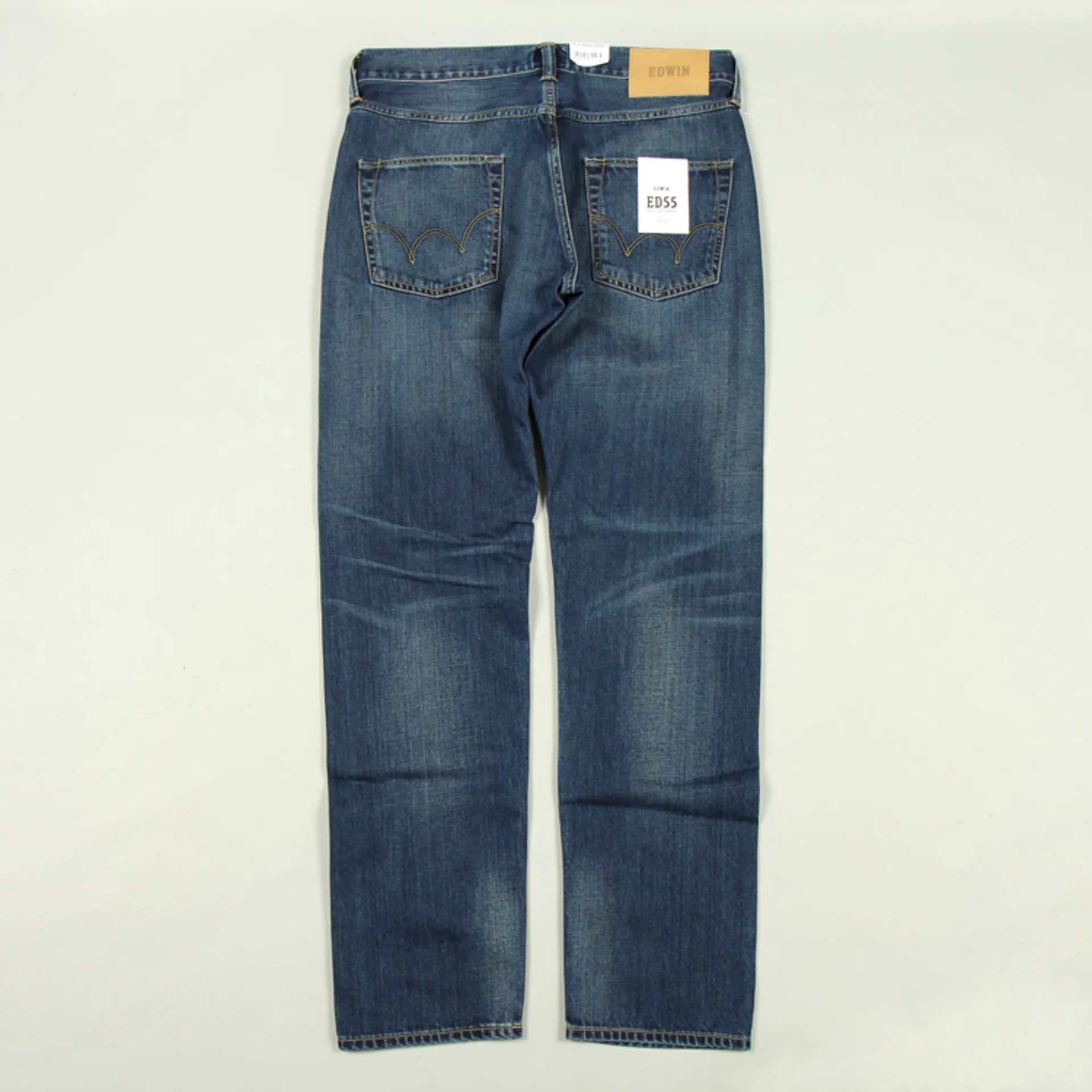 The ED-55 is a regular tapered fit pair of jeans from renowned Japanese denim brand Edwin. These five pocket jeans have a mid rise, are quite regular on the thigh and taper into the ankle, though not too tightly. Constructed in their Deep Blue denim, these versatile jeans are completed by a branded leather patch at the rear.