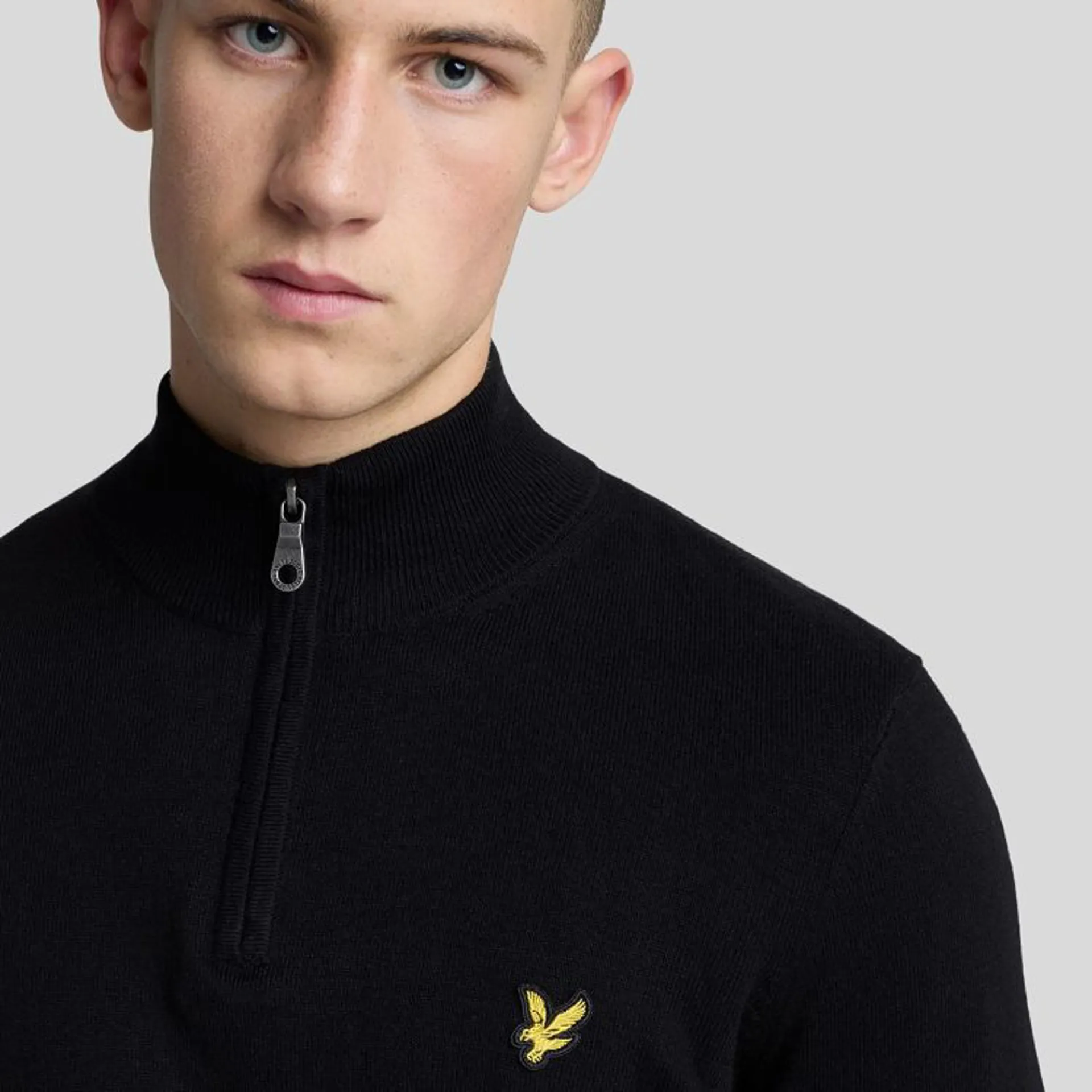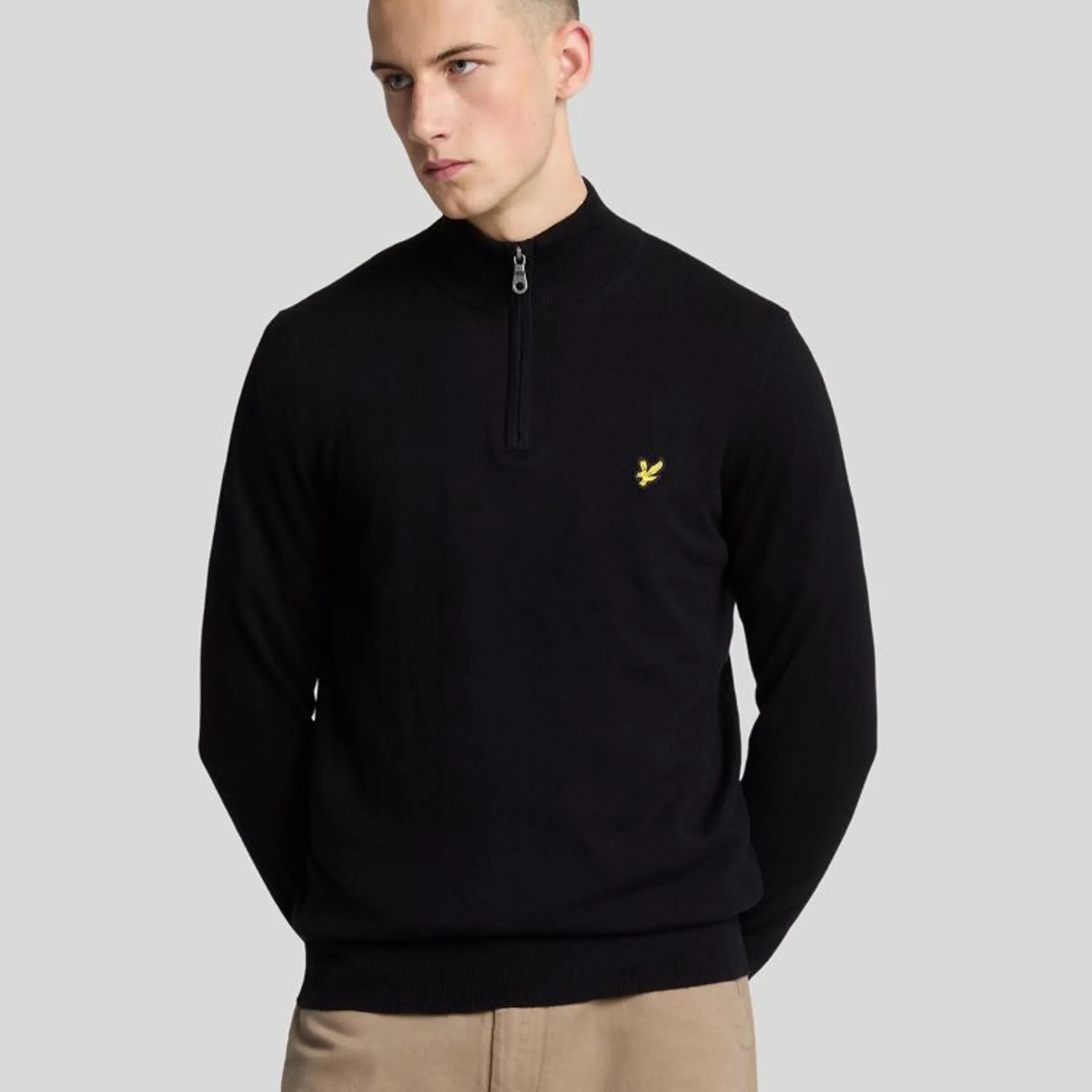 The Cotton Merino Quarter Zip Jumper from Lyle and Scott is crafted from premium cotton and merino wool in a regular fit. This piece of knitwear has a funnel neck collar with concealed zip fastening, ribbed collar, cuffs and hem, and the brand’s signature golden eagle at the chest.