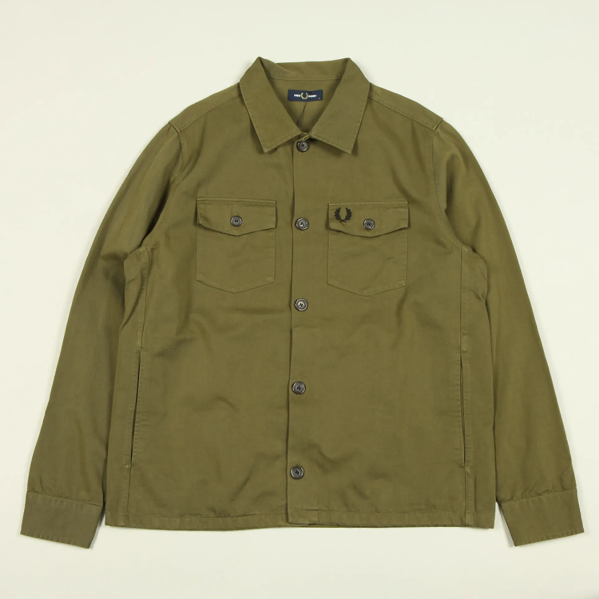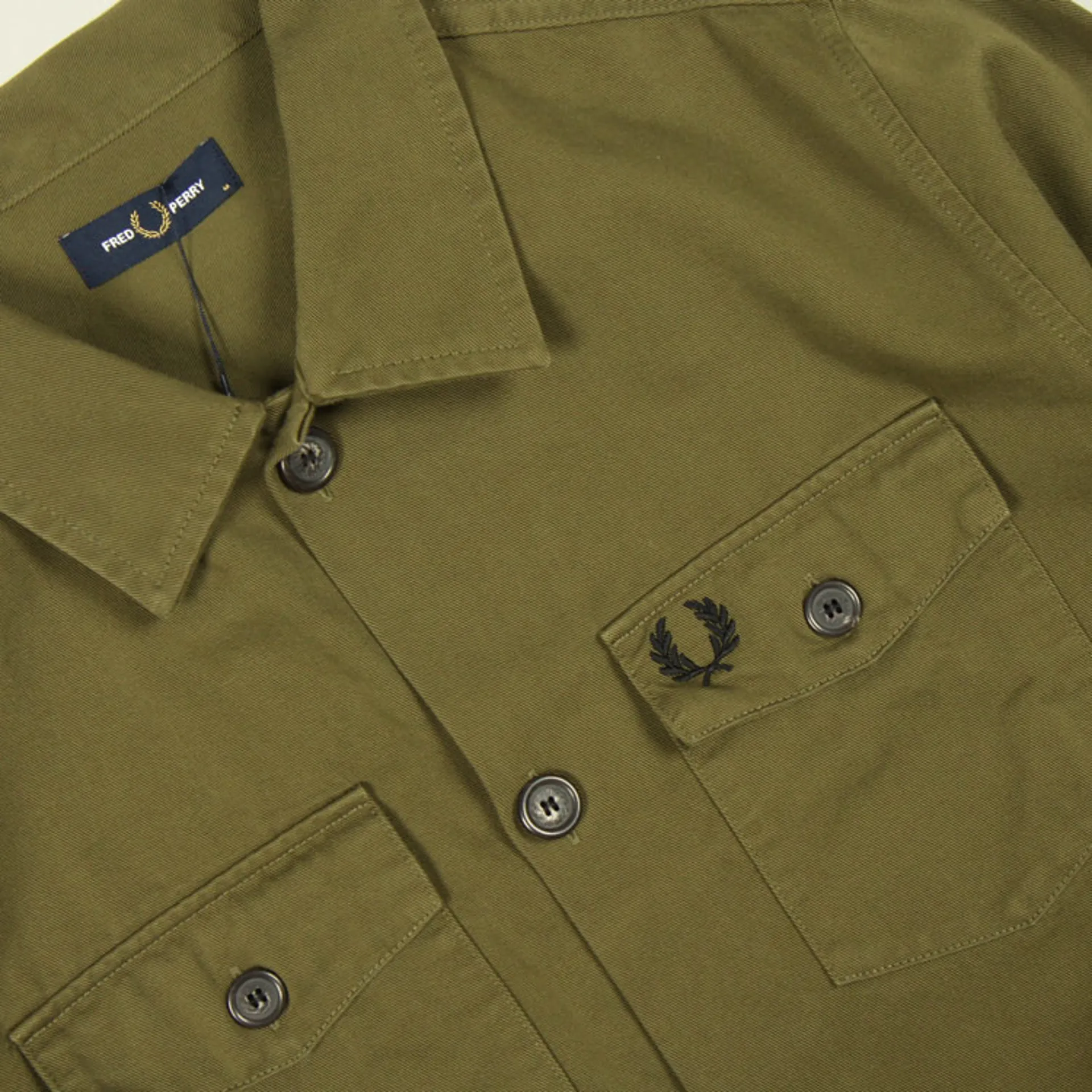 The Twill Overshirt from Fred Perry is constructed from a heavyweight cotton twill fabric in a boxy fit. This overshirt (or shirt jacket) has full button closure, twin buttoned chest pockets, a straight hem and an embroidered laurel wreath upon the left chest pocket.
