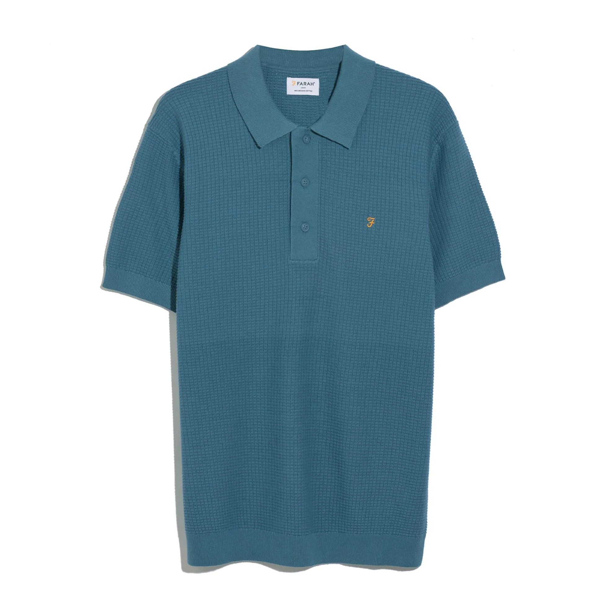 The Thornley Knitted Polo Shirt from Farah is made from organic cotton in a relaxed fit. The short sleeve knitted polo has a textured waffle construction. In addition, the polo has a tonal ribbed collar, tonal ribbed cuffs, a three button placket and an embroidered motif at the chest.