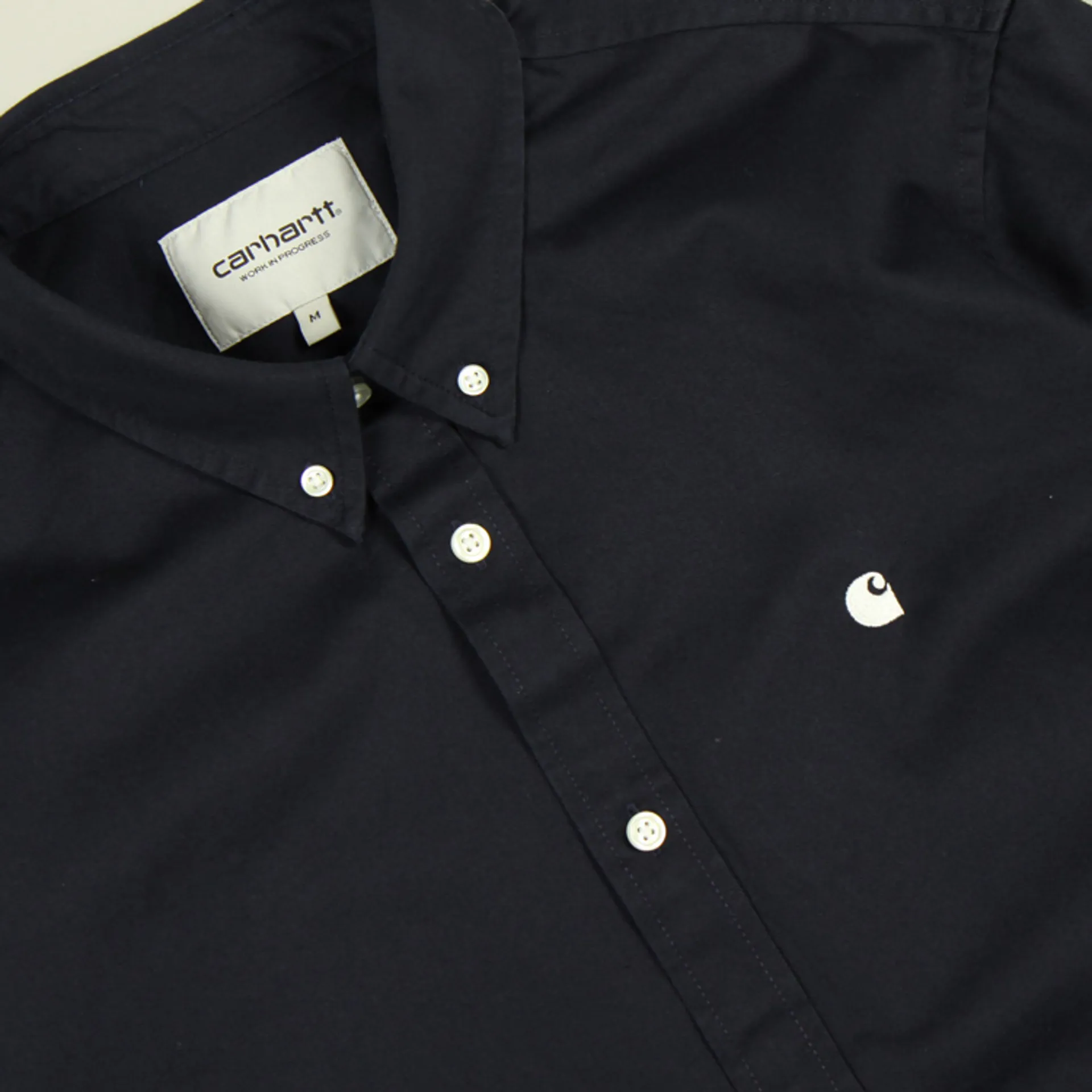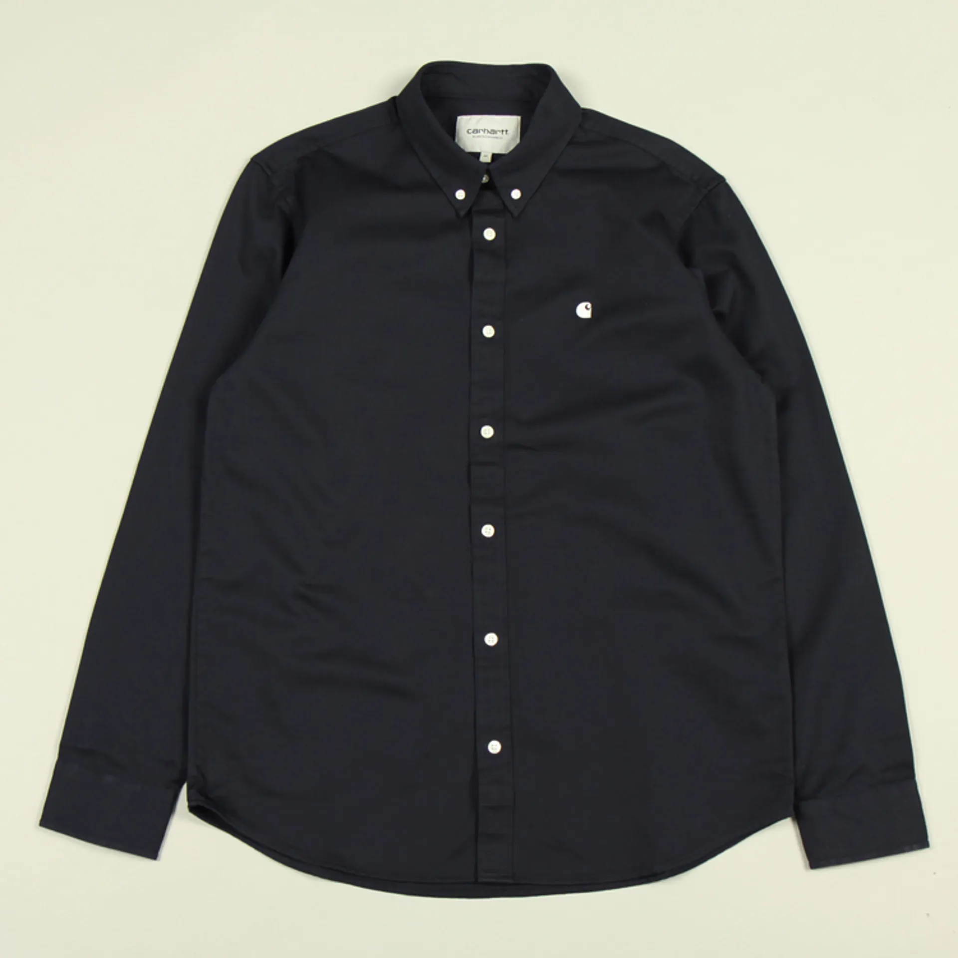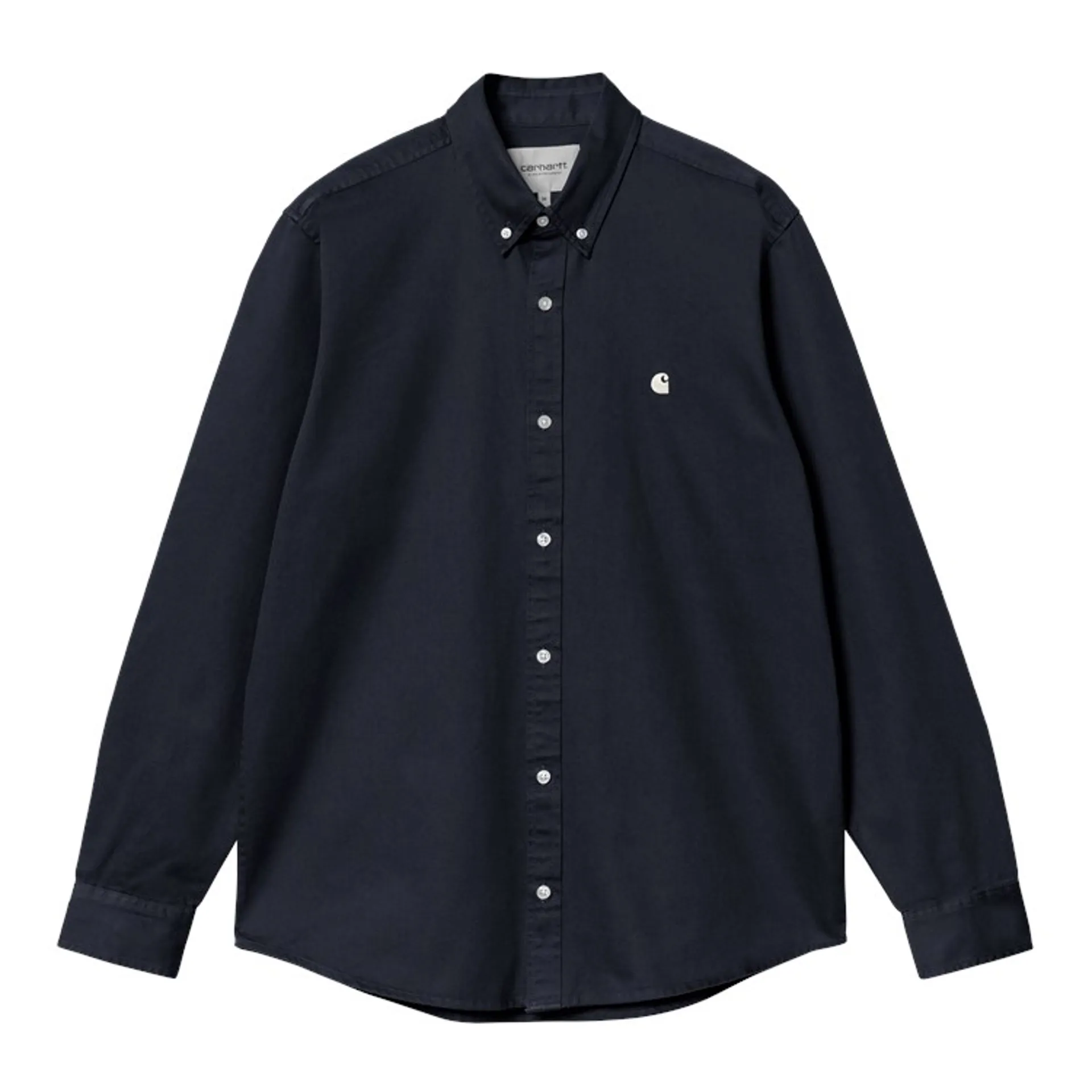 The classic Madison Shirt from Carhartt WIP is fashioned from heavy garment washed cotton twill and features button down collar, curved hem, branded buttons, embroidered logo at chest and script label at placket.
