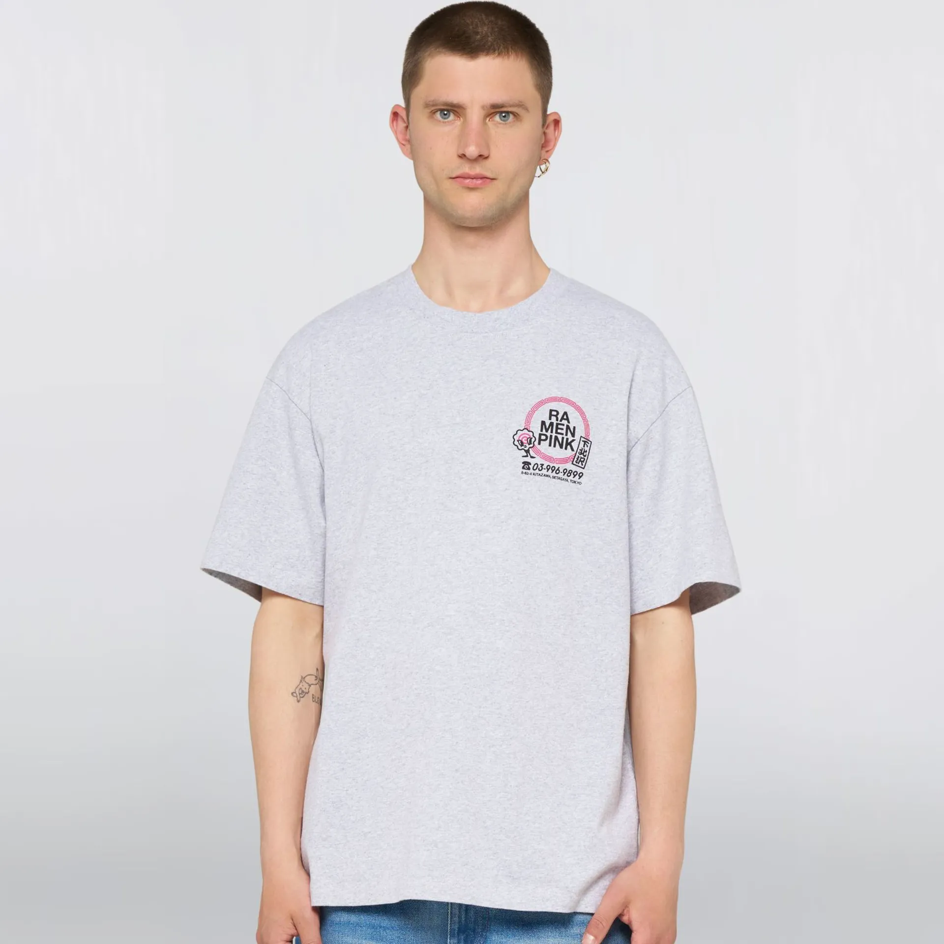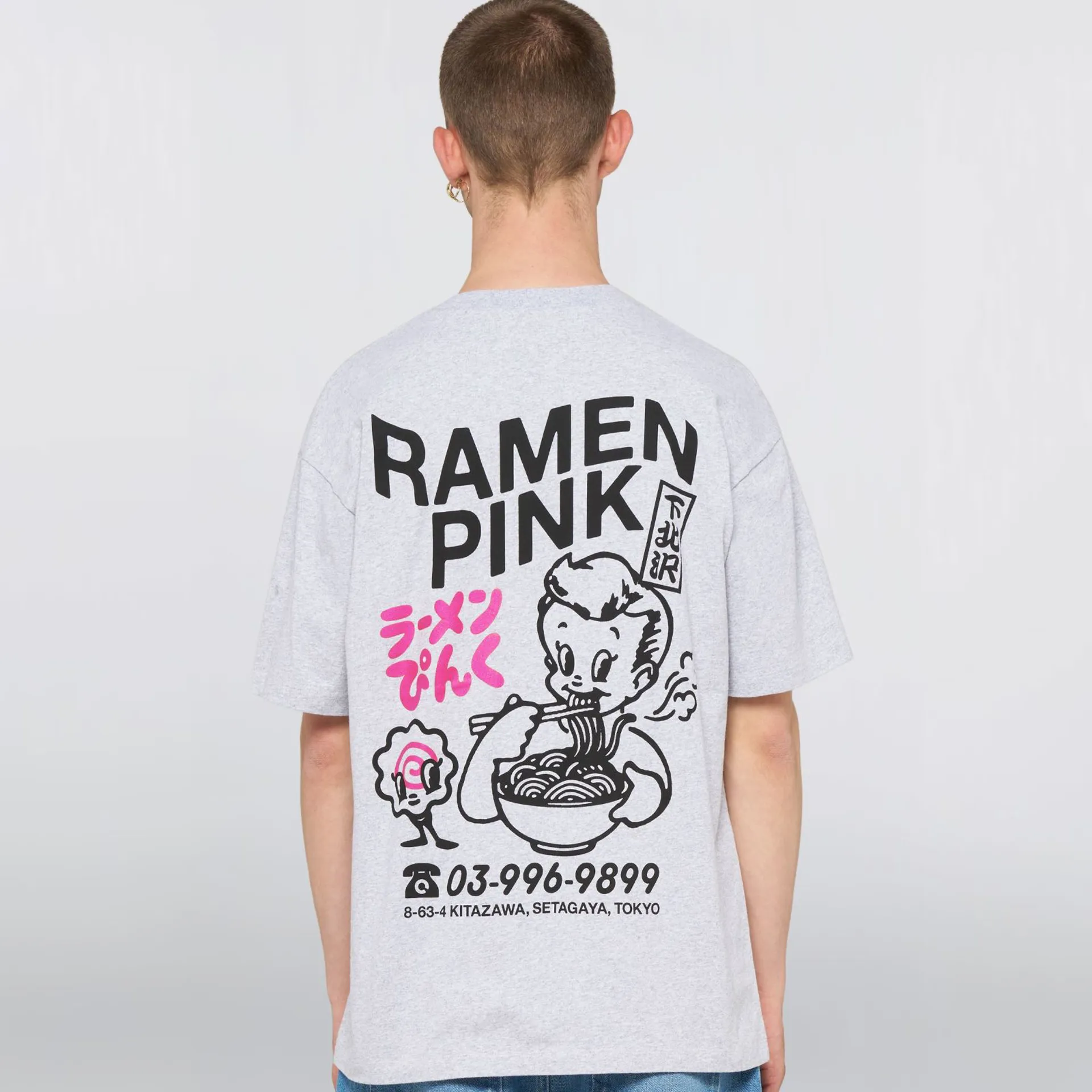 The Ramen Pink T-Shirt from Edwin is crafted from soft cotton jersey in a boxy fit. This tee has a ribbed collar and features graphic prints at the chest and back.
