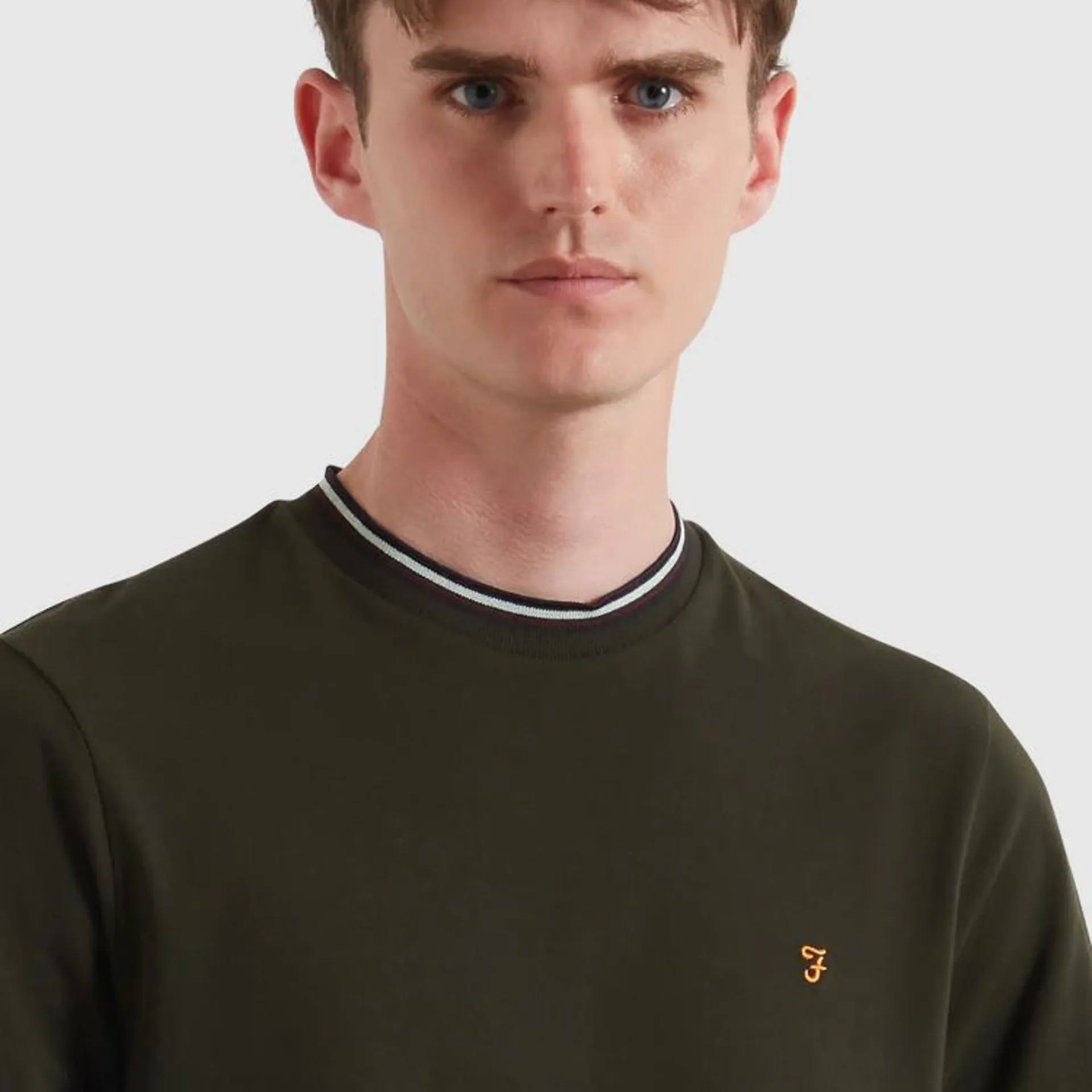 The Elton Tipped T-Shirt from Farah is made of organic cotton in a regular fit. This pique tee has a ribbed and tipped crew neck collar and is completed by an embroidered motif at the chest.